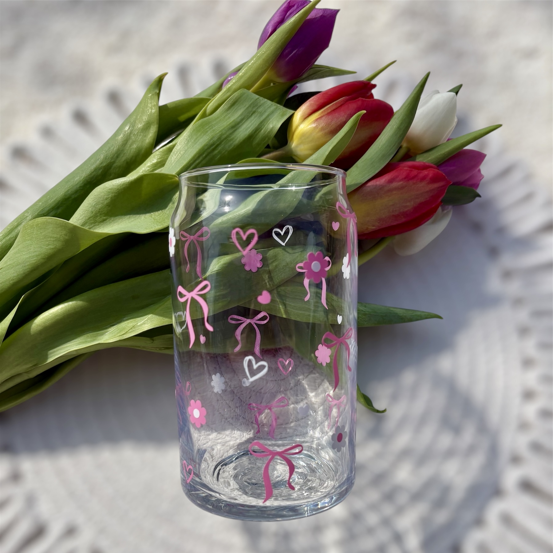 Stylová sklenice s ouškem a víčkem, zdobená bílými květy a srdíčky. Skvěle se hodí na osvěžující nápoje, ledovou kávu nebo smoothie. Dodává se s žlutým brčkem a šroubovacím víčkem.